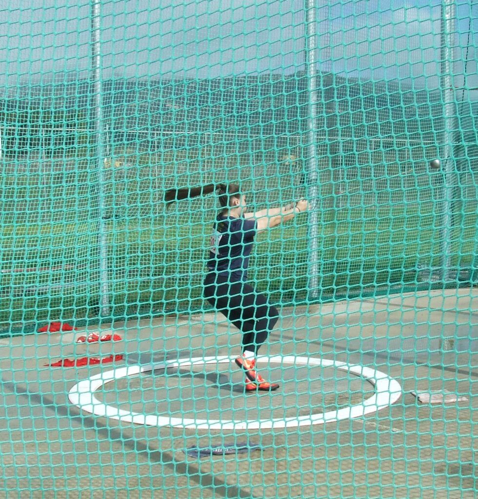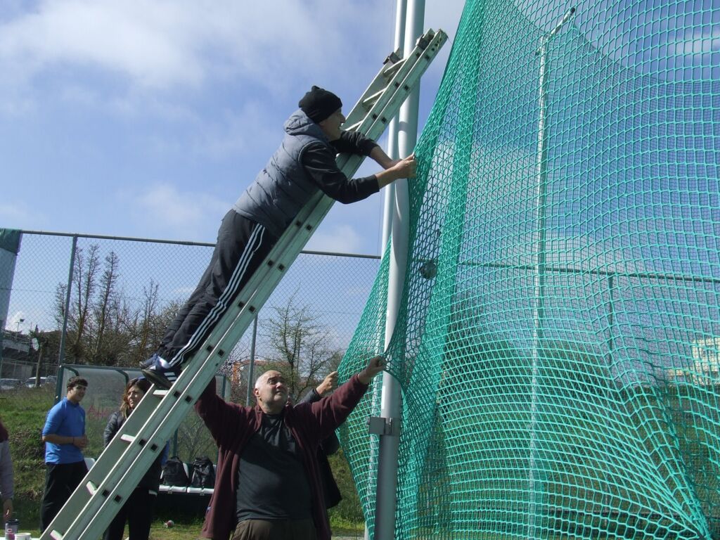 Ο προπονητών των ριπτών του Α.Ο.Π.Φ, Νίκος Γεωργίου σκαρφαλωμένος στη σκάλα ξεμπλέκει μια σφύρα.